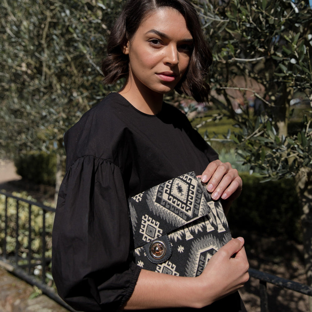 Handcrafted, power loomed bag featuring an Aztec-inspired design. Made from a blend of surplus organic cotton and polyester fabric, this stylish shoulder bag includes a detachable strap for versatile wear. Choose to wear it over the shoulder, as a crossbody, or handheld.