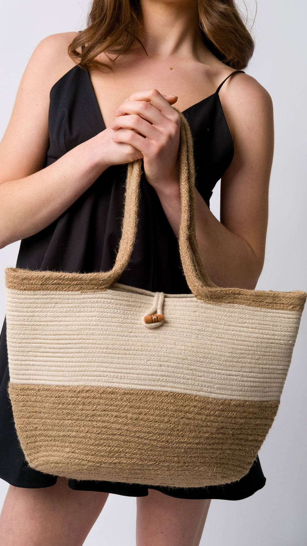 This cotton & jute shoulder bag is both large and robust, featuring a wooden toggle closure. Whether you're exploring the town or relaxing on the beach, this timeless piece offers ample space and impressive durability.