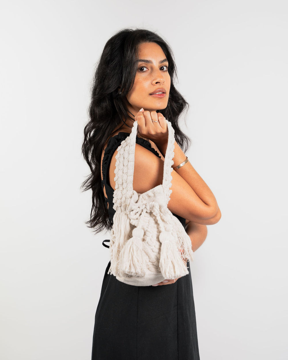 Crafted with organic cotton and featuring a drawstring tassel detail, this hobo bag boasts a small handle and intricate woven design. Keep your essentials secure and elevate your style with ease.