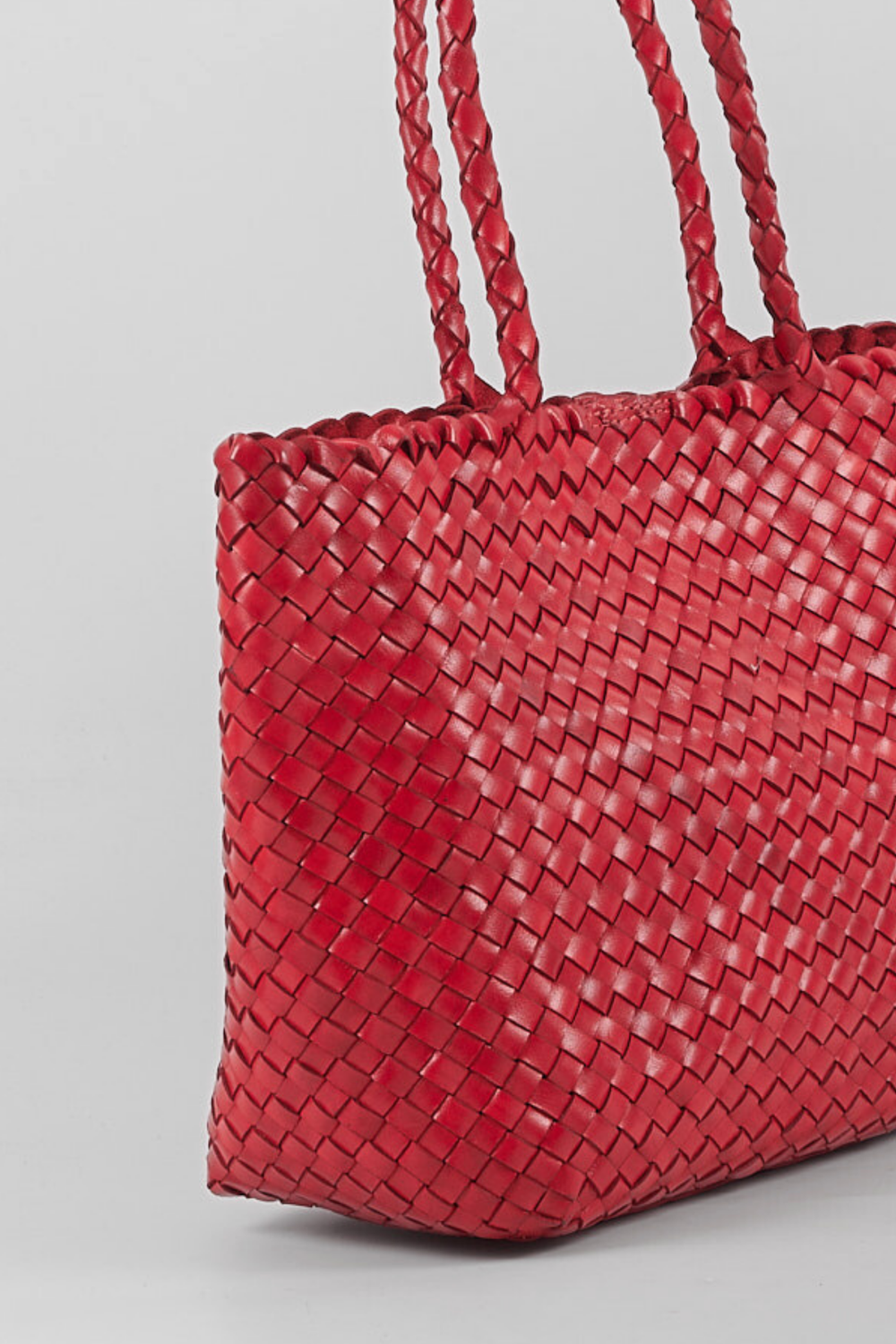 Indulge in the ultimate storage solution with our Leia Woven Leather Box Bag in Red. Crafted from chrome free leather, this bag boasts a spacious base and sides and securely fastens with a magnetic stud. Chic and versatile, the bag takes on a unique aesthetic when closed as the beautiful weave shimmers and transforms in the light.